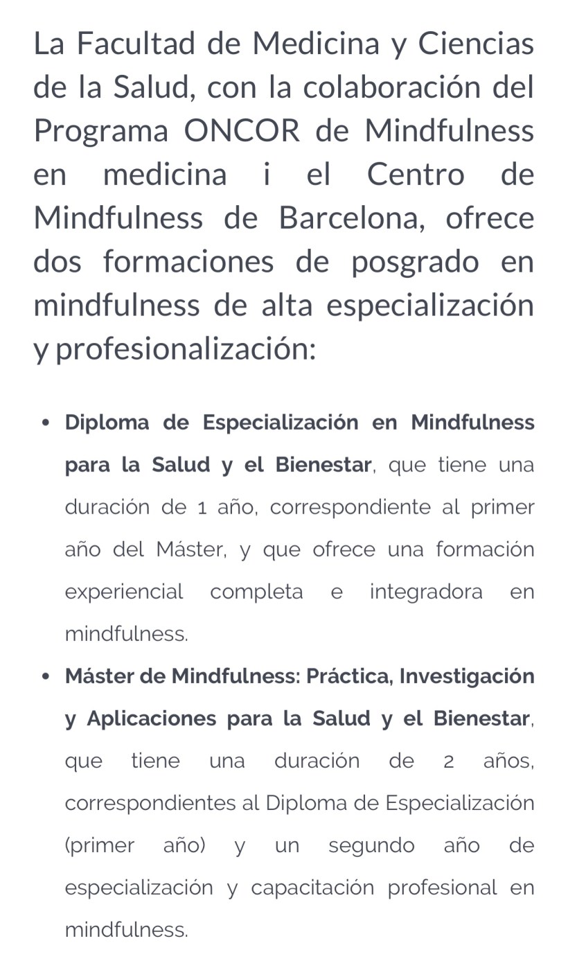 Programa CEB – Cultivando el Equilibrio Emocional completo como parte del MASTER EN MINDFULNESS Y SALUD de la Facultad de Medicina -Univerdidad de Barcelona. Promocion 2026-2028